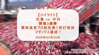 カープ動画ハイライト 【カープハイライト動画】中日戦 開幕3連勝 栗林良吏プロ初先発1安打完封 マダックス達成!(2026年03月29日)
