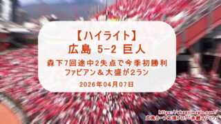 カープ動画ハイライト 【カープハイライト動画】[広島 5-2 巨人]森下7回途中2失点で今季初勝利 ファビアン&大盛が2ラン(2026年04月07日)