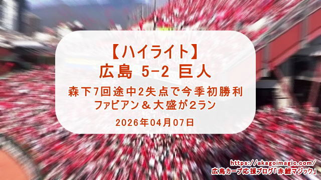 本塁打 :[広島] ファビアン 1号(4回裏2ラン),大盛 1号(5回裏2ラン)